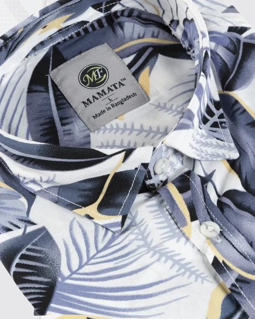 - Cool-Toned Print: The shirt features a high-contrast, all-over pattern of lush, oversized foliage set against a crisp white background. The large-format leaves, including stylized palm and monstera leaves, are rendered in an elegant cool blue gradient, mixing dark blue and gray indigo shades.